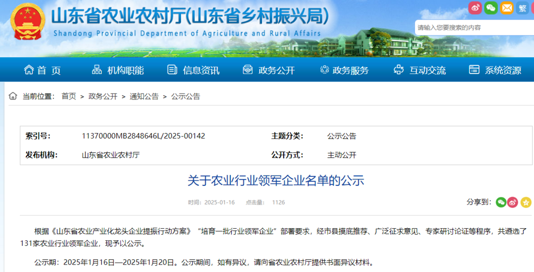 根據《山東省農業產業化龍頭企業提振行動方案》“培育一批行業領軍企業”部署要求,經市縣摸底推薦、廣泛征求意見、專家研討論證、公示等程序,共遴選了131家農業行業領軍企業。