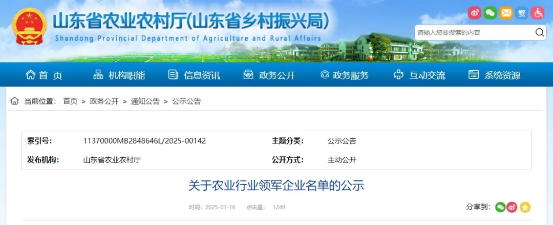 1月16日山東省農業農村廳網站發布《關于農業行業領軍企業名單的公示》好當家 位列其中具體公示如下: