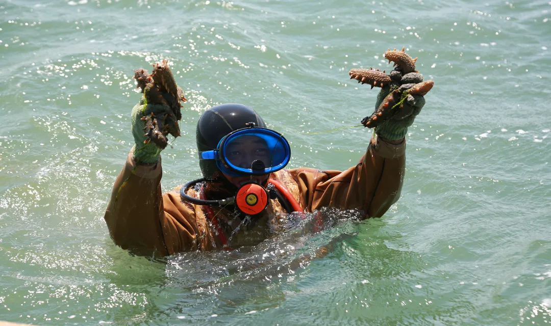 “海猛子”們在海面下忙碌地進行海參捕撈以供應各地市場,一兜兜鮮活的海參陸續被捕撈上船。